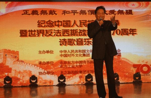 金秋九月,继天安门广场大阅兵之后,北京又迎来一次盛会,由 中华人民共和国文化部、中国诗歌学会、中国对外文化集团 、世界华语诗歌联盟,北京东方中国诗书画院、北方工业大学、龙之旅控股集团有限公司、北京书香满园文化传播有限公司等单位联合举办的"正义无敌 和平无价 大爱无疆"——纪念中国人民抗日战争暨世界反法西斯战争胜利70周年诗歌音乐会,于9月20日在北方工业大学举行。