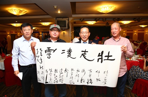 赞助商北京山河如画传媒有限公司总经理刘同(左一)、 嘉宾张宪国(中) 、北京首都机场旅业有限公司副总、瑞海姆田园度假村总经理杨敬东(右一)签到