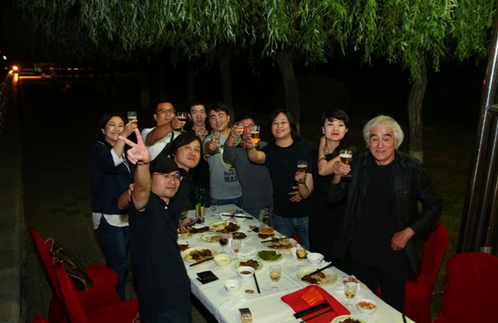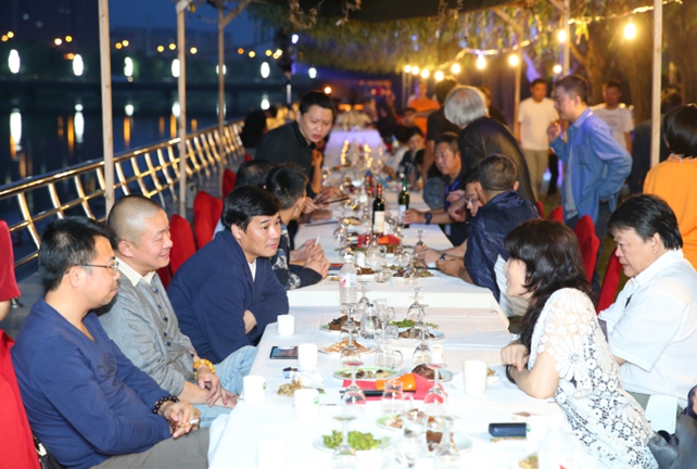 长桌篝火晚宴现场淘宝营销事业部总经理卢维兴(左一)、星空壹禾影视总经理白祺帆(左二)、诗人芒克(右一)、中国诗歌网主持人杨思思(右二)、歌手蒋山(右三)、青年诗人张大川(右五)
