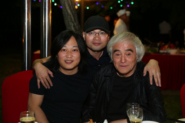 长桌篝火晚宴现场歌手蒋山(左一)、淘宝营销事业部总经理卢维兴(中)、诗人芒克(右一)