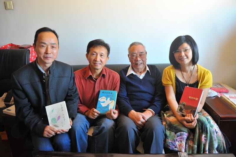 杨志学、纯玻璃、孤城手捧李瑛老师诗集,与李老合影。