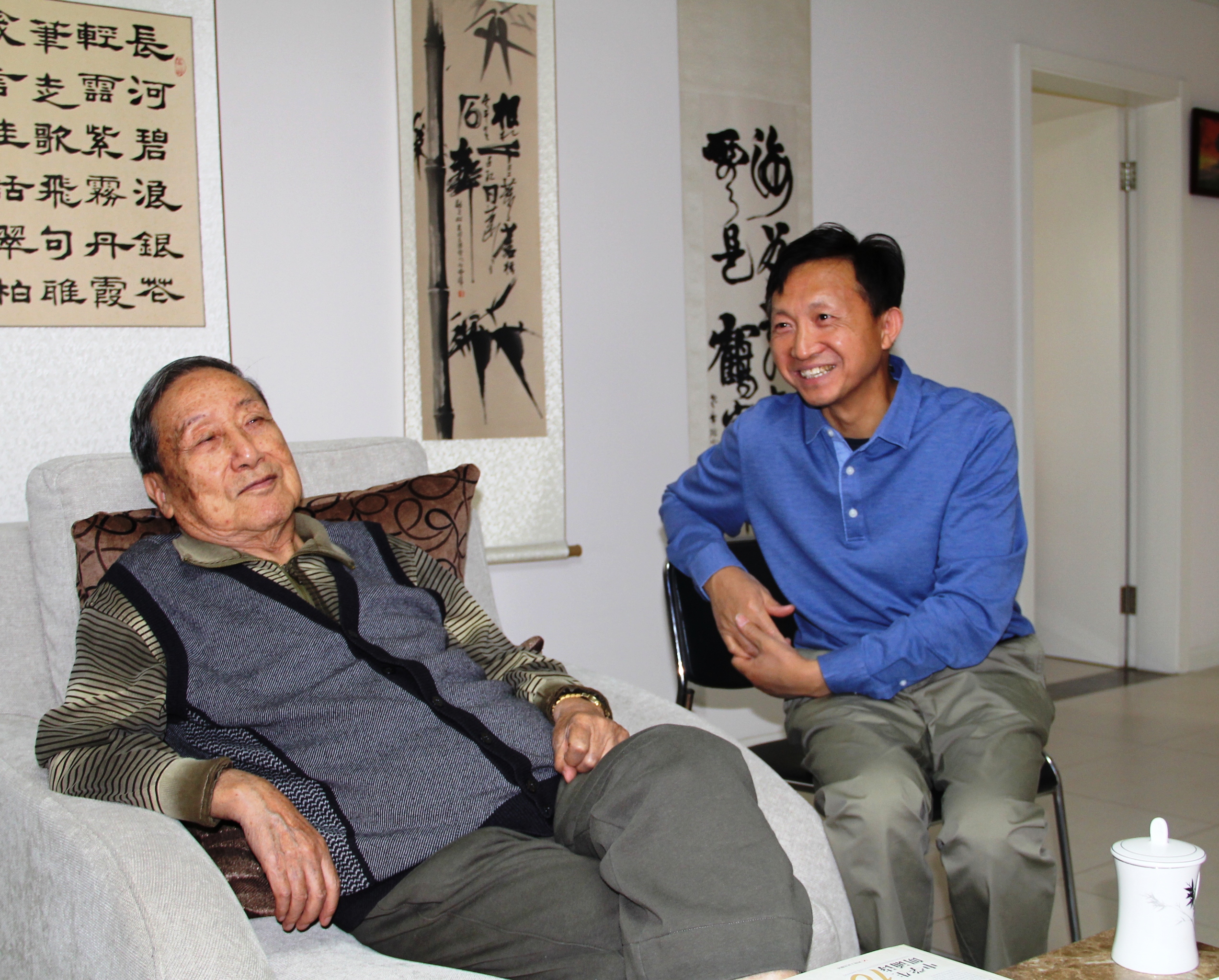 我看到,已过耄耋之年的贺敬之先生,身体依然健朗结实,耳聪目明。由于年事已高,贺老现在很少接受来访。他同意杨志学前来访问,一是因为杨志学2009年主编的诗集《新中国颂》曾给他留下较深的印象,二是他要对中国作协下辖的中国诗歌网这样的新媒体的创建表示支持。我们按时到来,贺老亲自开门相迎,与我们一一握手,一下子去除了我们心理上的紧张。