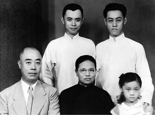 夏志清(后排右)、夏济安(后排左)1947年摄于上海照相馆,前排依次为夏父、夏母及妹妹夏玉瑛