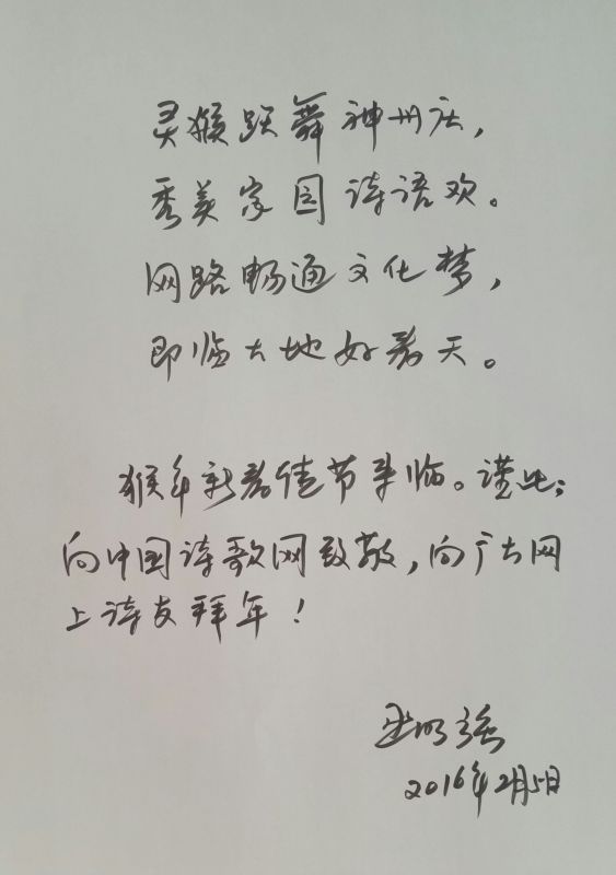 北京诗人、水利部老干部局副局长巫明强的新春寄语:灵猴跃舞神州庆,秀美家园诗语欢。网路畅通文化梦,即临大地好春天。猴年新春佳节来临。谨此:向中国诗歌网致敬,向广大网上诗友拜年!