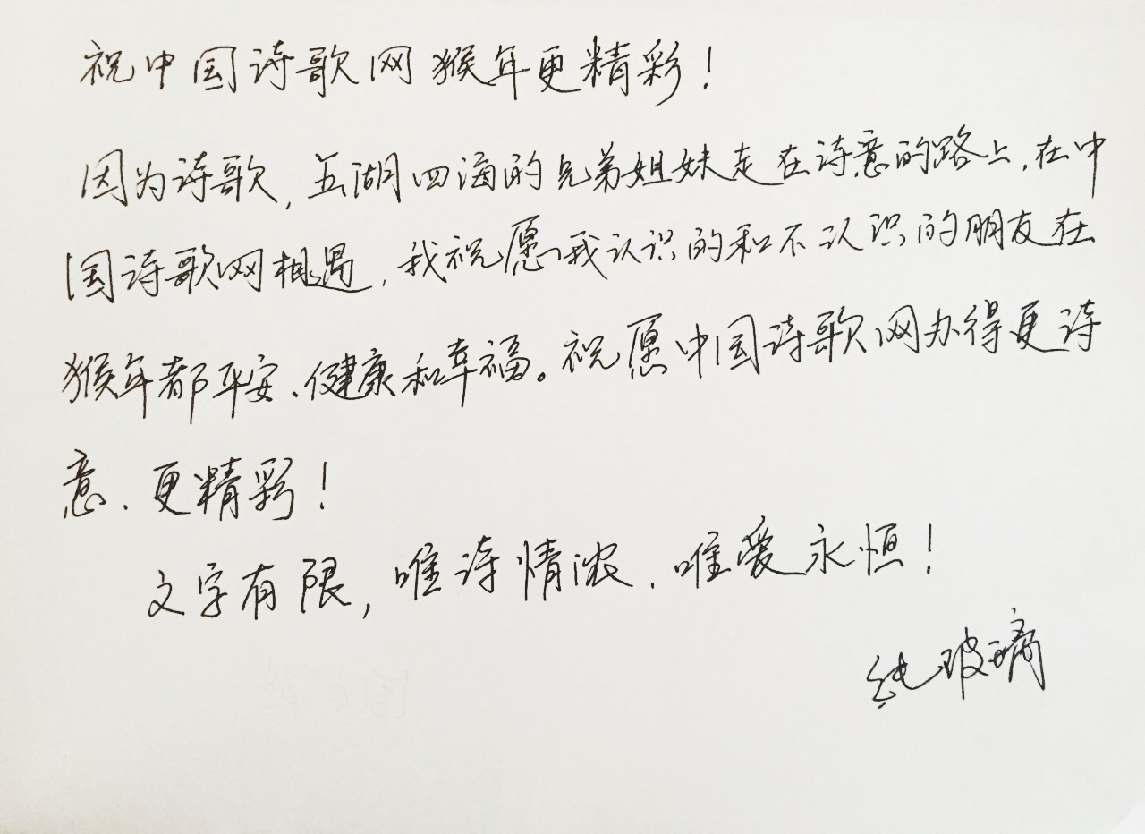 北京诗人纯玻璃新春寄语:祝中国诗歌网猴年更精彩!因为诗歌,五湖四海的兄弟姐妹在诗意的路上,在中国诗歌网相遇,我祝愿我认识的和不认识的朋友在猴年都平安,健康和幸福。祝愿中国诗歌网办得更诗意、更精彩!文字有限,唯诗情浓,唯爱永恒!