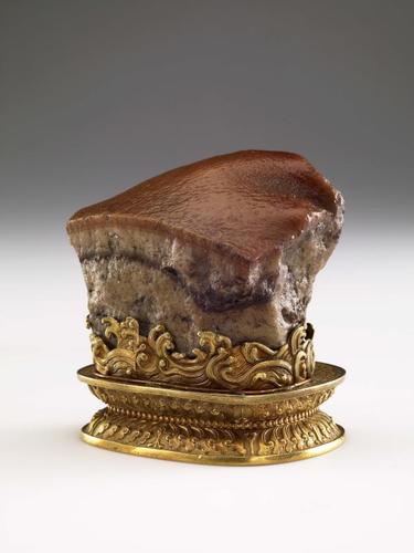 用玉石雕刻写实性的动物花草,传流悠久。但是用来表现家喻户晓的炖猪肉,却是清代玉匠的新创意。玉雕技艺中有一个专业用词:“巧做”,用来衡量玉工的智慧设计和琢工技巧。这件肉形石,充分保留了原体材料,呈不规则块形。利用天然形成的石层,表现深厚的刨面,从肉皮、肥脂到里脊部位,完整具到。玉工对上表皮进行了人工染色和抛光,呈现油润滋滑的烧肉皮。对肉块各处点点,先做了凿刻处理,再对坑洼处进行染色,制造出肌理纹路。整体似一块脍炙人口的东坡肉。精心布局、纤细巧工,是晚清时期的巧做典范,凝聚了玉匠高度的自然主义、写实主义理念。