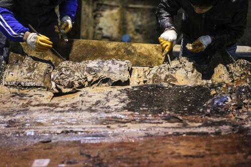 2015年12月19日,江西南昌,汉代海昏侯墓发掘现场,考古工作人员正在现场清理、测量,准备打开棺木,海昏侯墓自五年前开始发掘以来出土了大量金、玉、竹简等十分珍贵的文物。 本组图片均来自澎湃新闻记者 李坤