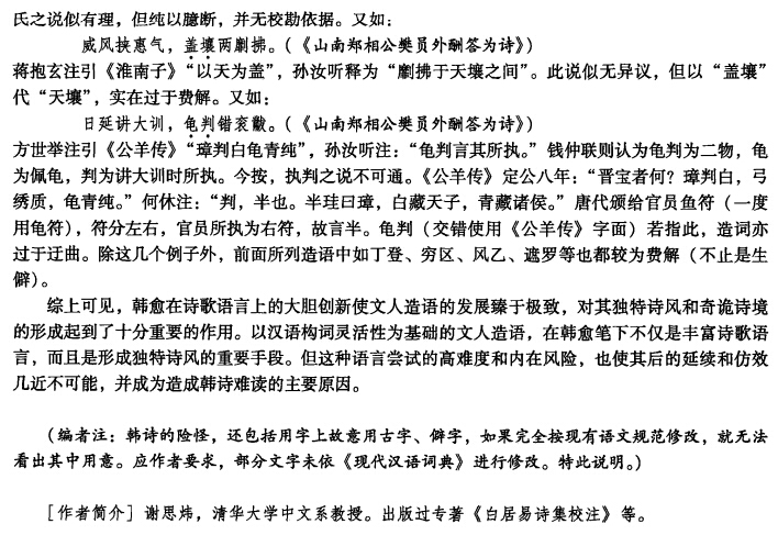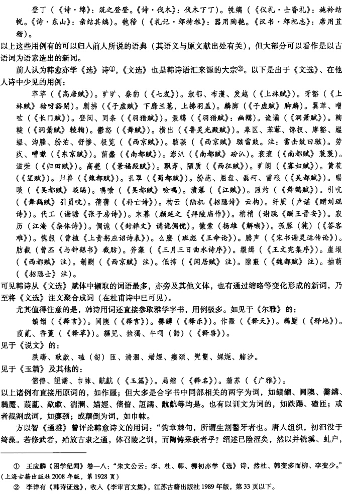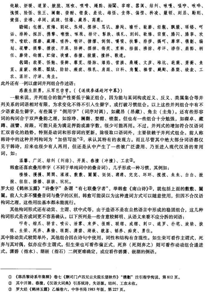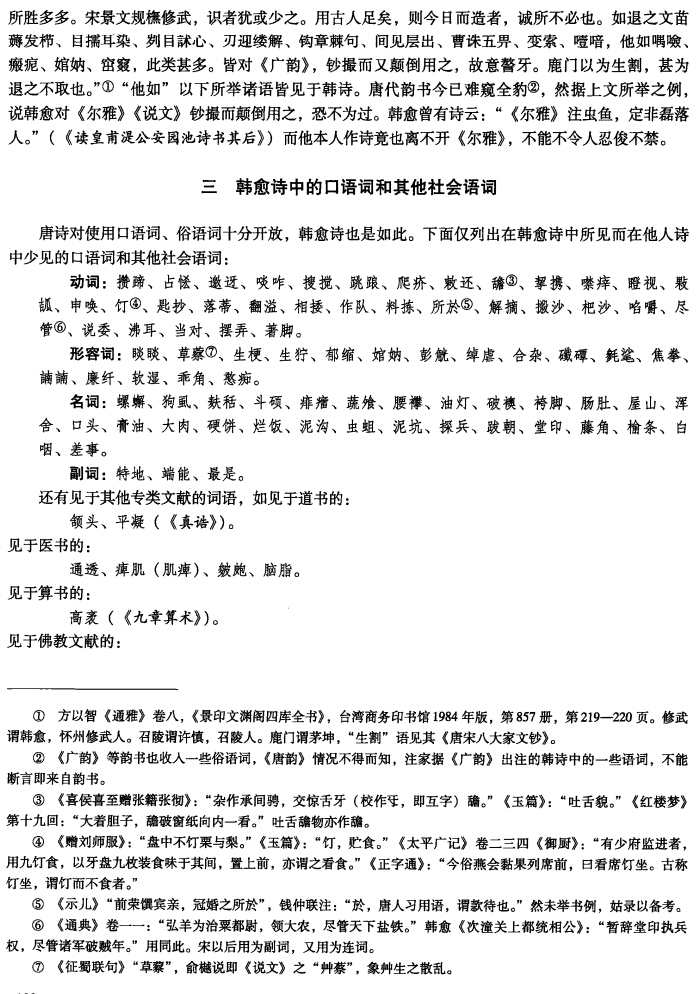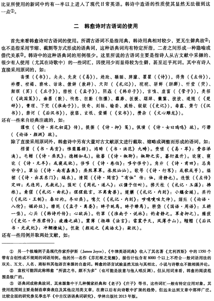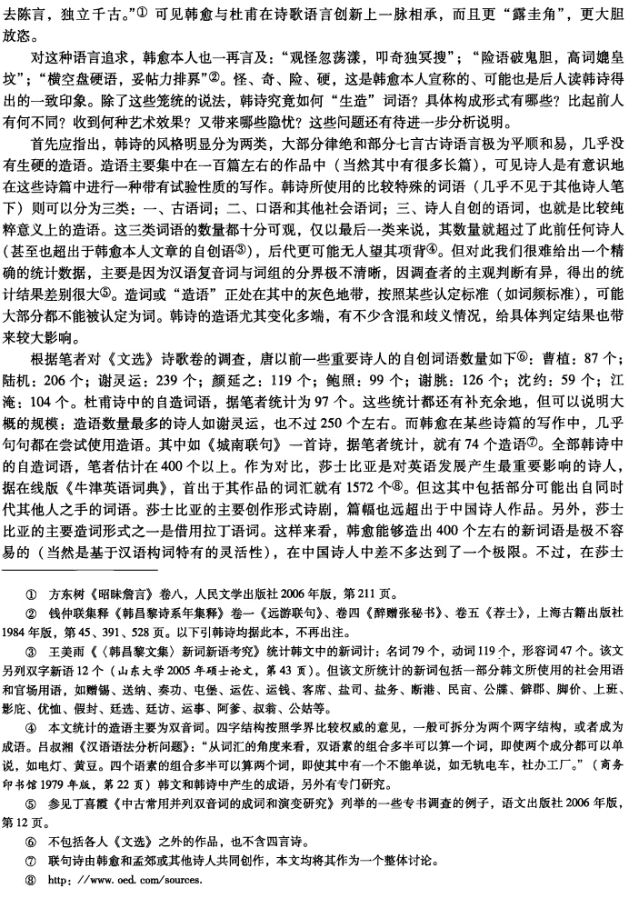 摘要:韩愈诗歌所使用的特殊语词包括:一、古语词;二、口语词和社会语词;三、诗人自创的语词。其中第一类中以古语词语素所造新词和第三类词语都可以算作诗人的"造语"。韩愈诗中的造语数量远超出于前人,对于形成其独特诗风和奇诡诗境起到了十分重要的作用。但韩诗造语往往不得不使用生僻字,或打破习惯组合,也成为韩诗难读的主要原因。这种语言尝试的高难度和内在风险也使其无法延续。