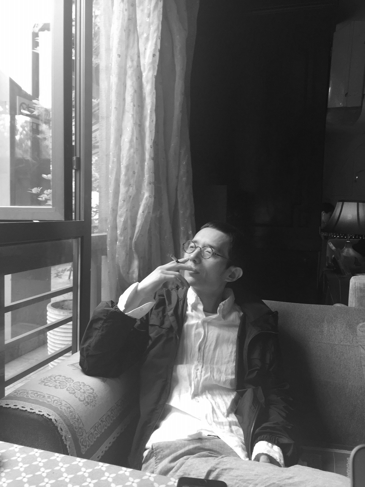 镜面玻璃中,你斜靠着椅背望向我