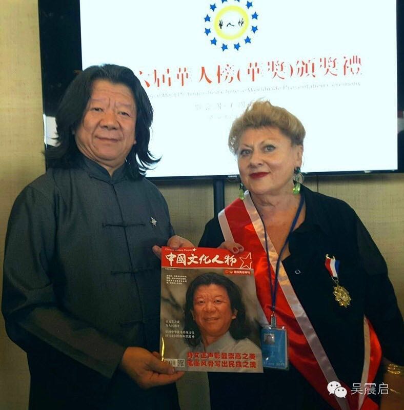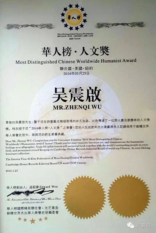 证书上这样写道:“尊敬的吴震启先生:鉴于您在诗书艺术领域取得的非凡成就,出色传达了一位诗人书法家应有的人文情怀。特别授予您“2016华人榜•人文奖”之荣誉!您的人生成就和杰出贡献将永久记录保存于剑桥世界华人荣誉史册中,做为您的终生荣誉典藏。