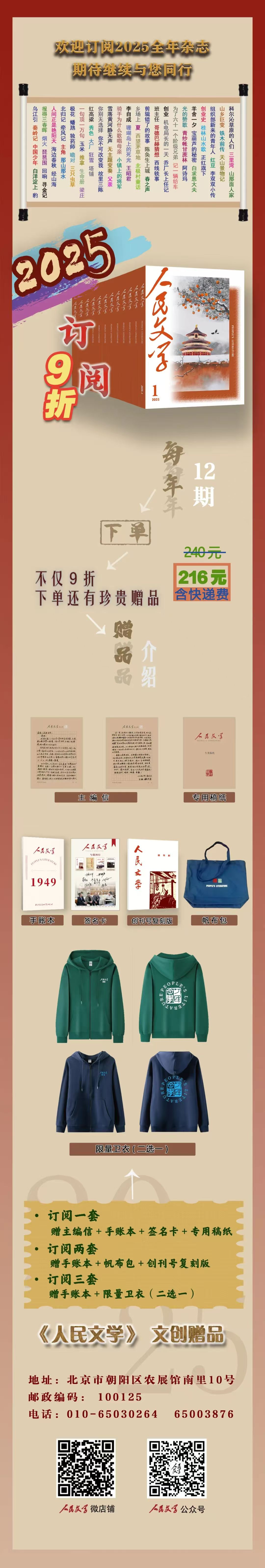 《人民文学》的发展,离不开一代又一代兢兢业业的办刊人辛勤耕耘,离不开一批又一批才华横溢的作家倾心相助,更离不开广大读者朋友们长久以来的深情呵护。在这个充满希望的时刻,为了能与您继续携手在文学的海洋中畅游,我们诚挚地向您发出征订邀请。期待您的继续支持,让我们一同续写《人民文学》的华彩篇章。
