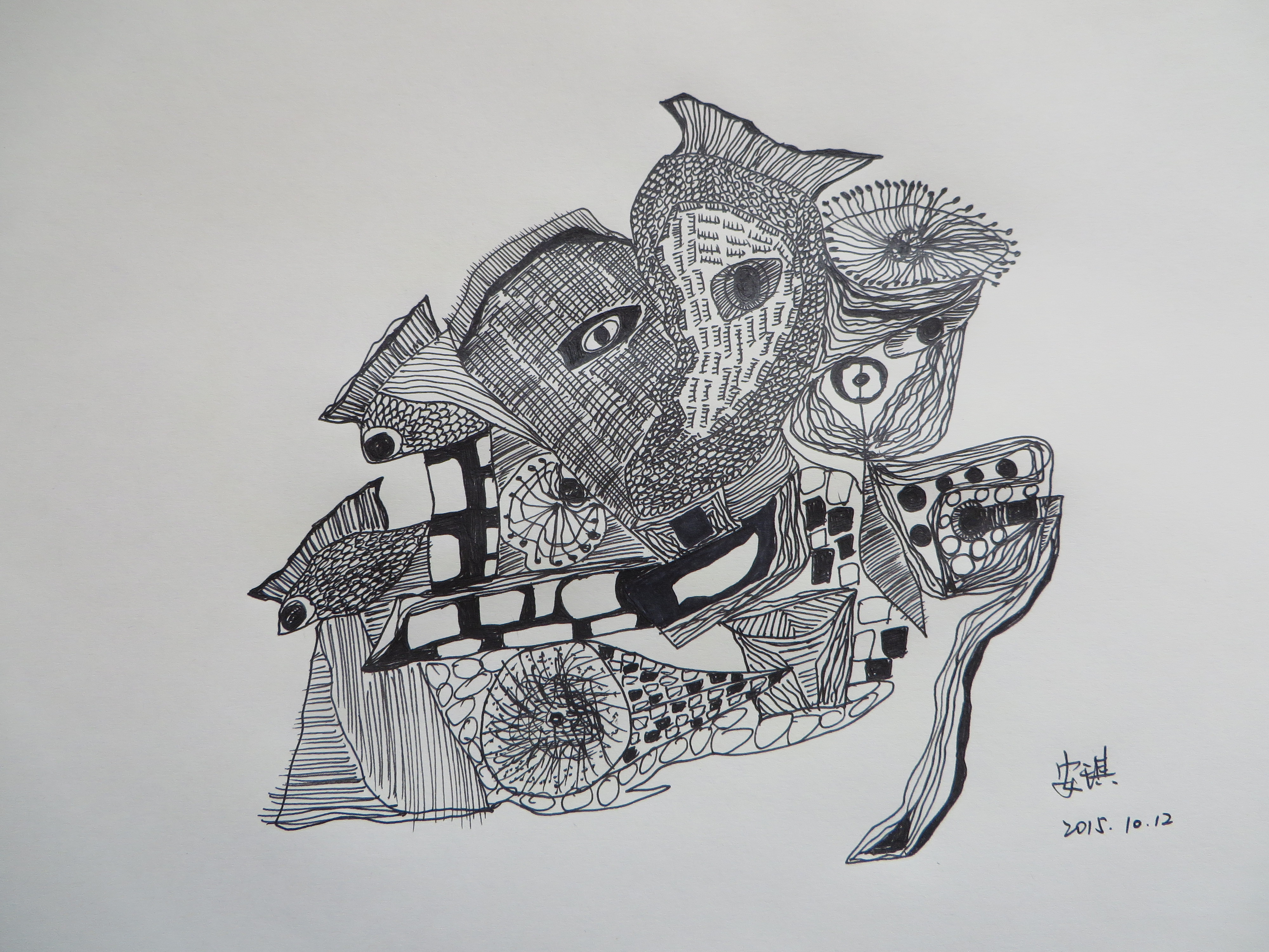 一切都在那个瞬间改变了,2015年8月,我应邀到西安参加首届青年诗歌艺术节,当地诗人王可田先行带我参观了半坡博物馆,半坡博物馆的镇馆之宝自然是“人面鱼纹盆”,其中“人面鱼”图像被做成各种LOGO随处可见。我长久而专注地凝视着这些放大在天花板和展馆墙上的“人面鱼”,心念顿起,绘画其实不需要老师,那开辟鸿蒙第一个画画的人一定没有老师,他/她能师从的只能是造化和自己的想象力。破除了教师迷信后回到家重新拿起钢笔便如有神助,完全跟2014年的判若两人,我自己认为是半坡那个人面鱼画师附体。我是一个艺术唯心论者,也时常体验到艺术的神秘力量,绘画即如是。相比于水墨、油画等其他门类,钢笔画只需一张打印纸一枝签字笔即可,几无成本,又简单,我自然选择钢笔画。每画完一张我就迫不及待发到微信,引来朋友们的一番赞叹,斗志更高,从2015年8月到2016年2月,半年时间画了一百多幅,真是画疯了。更大的鼓励来自于各期刊编辑师友,迄今已有《诗刊》等10几家刊物刊登了百余幅画作,还有许多朋友的诗集选用了我的画作作封面或插图,同时也有友人收购我的画作。