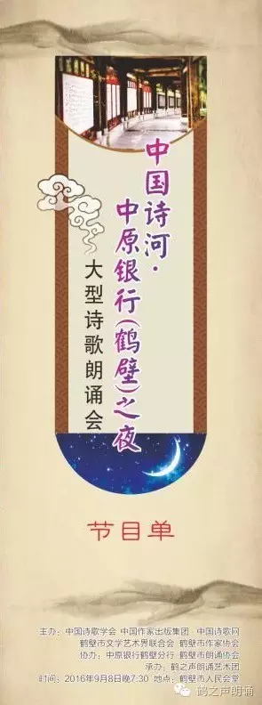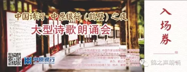 由中国诗歌学会、中国作家出版集团·中国诗歌网、鹤壁市文学艺术界联合会、鹤壁市作家协会主办,中原银行鹤壁分行、鹤壁市朗诵协会协办,鹤之声朗诵艺术团承办的“中国诗河·中原银行(鹤壁)之夜”大型诗歌朗诵会于今晚7:30在鹤壁市人民会堂隆重举行。