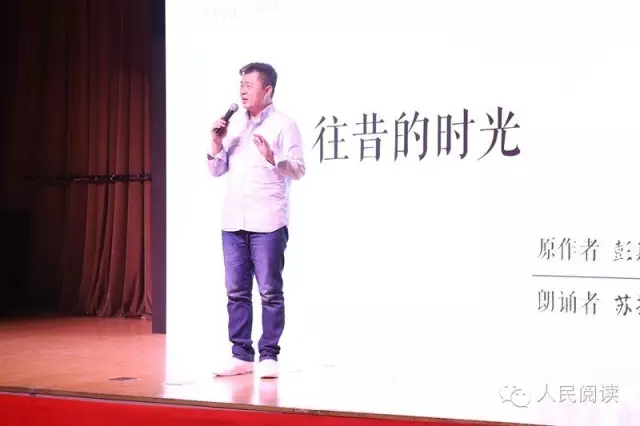 朗诵会最后,中央人民广播电台“中国之声”主播苏扬朗诵了彭斯的《往昔的时光》和王羲之的《兰亭集序》。他深情回忆起23年前喜欢“第三代诗歌”的广院同学王晓磊,把《往昔的时光》献给这位逝去的友人,他低沉、饱满的声音把全场观众带到了那个白衣飘飘的诗歌年代。他还现场即兴朗诵了自己根据广院大学生活改编的诗歌,在他伤感而动情的《归去来兮辞》的吟诵中将整场活动气氛推向高潮。