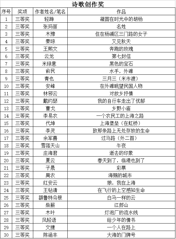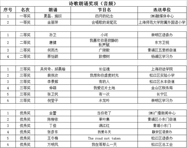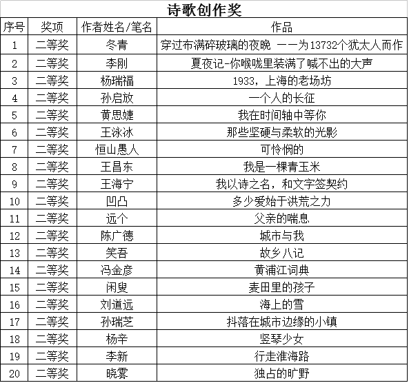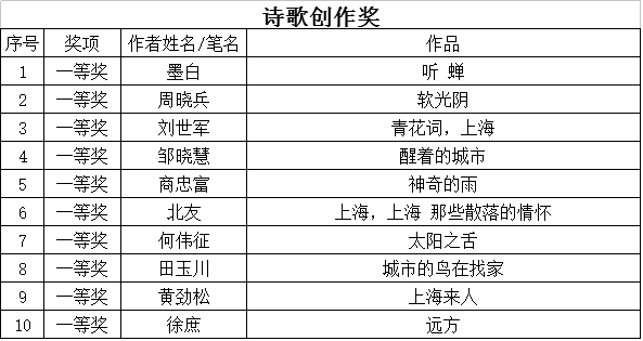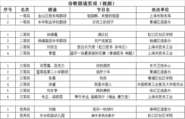 经专家评审,主办单位研究,现评审出“诗歌创作奖”、“诗歌朗诵奖项”、“优秀组织奖”三类奖项,予以公示。公示时间自2016年11月16日起至2016年11月22日。若对下列奖项有异议,请电话或书面向活动办公室反映。