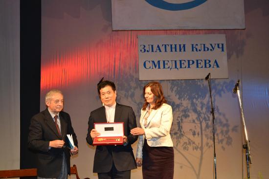 赵丽宏接受金钥匙奖后和斯梅德雷沃市长和德拉根合影