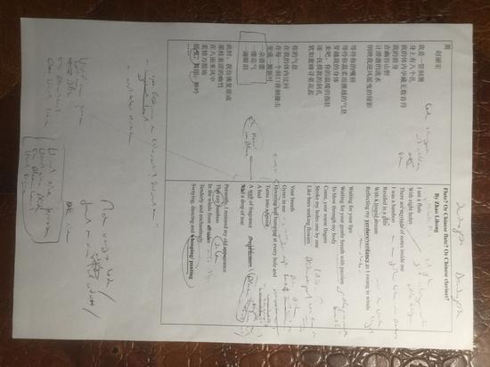 美国普利策诗歌奖兼英国艾略特诗歌奖双料得主莎朗•奥兹今年八月参加上海国际诗歌节期间读到赵丽宏的诗,非常喜欢并称赞他的诗风格奇特,引人遐想。在一次双方都参加的关于诗歌翻译的研讨会上,奥兹向赵丽宏仔细询问《箫》的汉语结构和意涵,逐字逐句琢磨翻译了这首诗,并当众朗诵。她说这是意象独特的诗,让人产生丰富深邃的联想,只有中国诗人才能写出这样的诗。回国后,奥兹又精心斟酌译文,并寄来了翻译手稿和打印出来的译诗定稿。