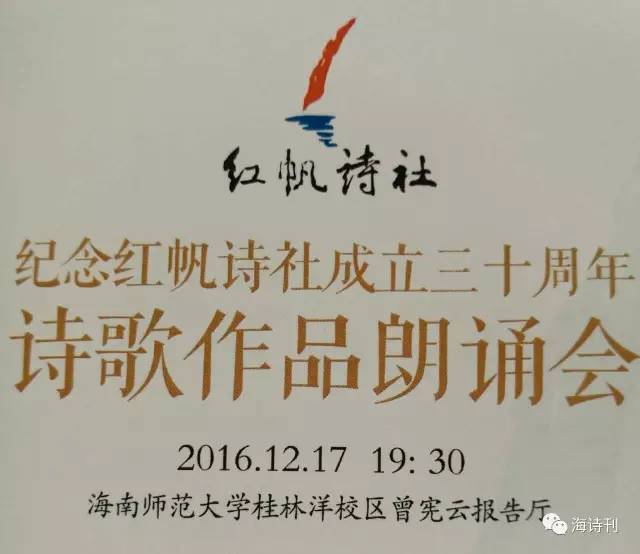 纪念红帆诗社成立三十周年诗歌朗诵会。2016年12月17日晚,在海南师范大学桂林洋校区曾宪云报告厅隆重举行。中国作协主席团成员、著名作家韩少功和著名诗人、红帆诗社创始人、首任社长远岸出席活动并致词。海南师范大学副校长杜明娥和红帆诗社现任社长侯东宸也分别代表了学校和诗社致词。