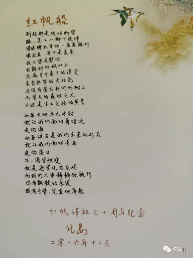 北岛不仅为红帆人题写了“红帆船”,更一笔一划亲手抄下他的经典作品之一“红帆船”赠予红帆人。