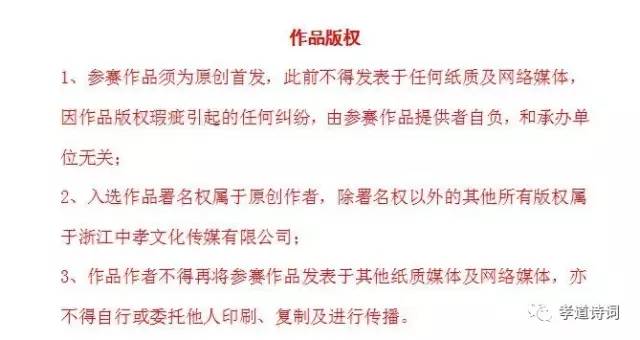 “中孝杯”全国首届家风·孝道诗词创作大赛所有参赛作品应严格遵守本次大赛的参赛要求,如有违规现象且经核实情况属实者,将取消其获奖资格,大赛相关版权要求如下: