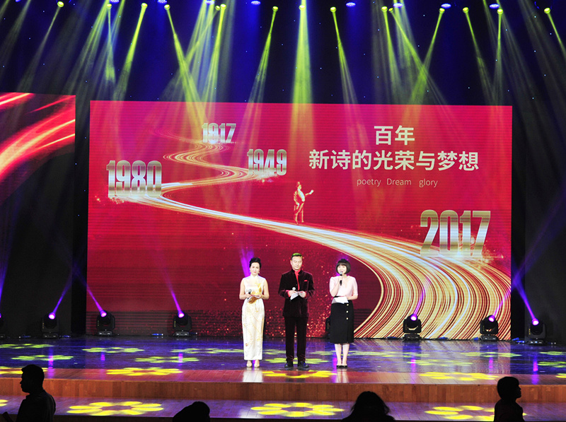 2017年2月21日晚,以“百年新诗的光荣与梦想”为主题的2017年第二届华语诗歌春晚,在北京大学百周年纪念讲堂成功举行。屠岸、高瑛、吴思敬、任洪渊、食指、赵振江、唐晓渡、谭五昌、陈旭光、黄亚洲、祁人、潇潇、李少君、章燕、远岸、马少福、姜念光、冰峰、顾建平、杨四平、雁西、周占林、刘以林、唐成茂、安琪、海田、赵晏彪、冯章、爱斐儿、关雎、查曙明、方文、刘继保、龚璇、柳必成、刘毅、马慧聪、花语、夏露、刘蔚、柳春蕊、东方乔、赵士泉、娜仁琪琪格、阿B、刘子肃、苏微凉、康桥、王永江、胡芳、姚鸿飞、张脉峰、张立宁、冯朝军、弱水、刘雅阁、格格、若水、冷宇飞红、大可、王爱红,以及虹云、任志宏、刘纪宏、杜宁林、张宏、秋风等百余位诗人、评论家、翻译家与艺术家与会,同时来到现场的还有来自北京大学、北京师范大学等高校的师生代表及社会各界人士共500余人,晚会规模宏大,气氛热烈。