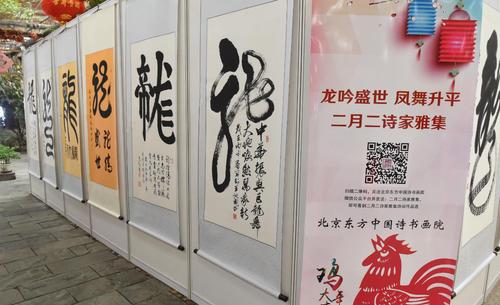 活动现场,同时展出了赵立凡、王勇平、张继、王阔海、王学龄、邹德忠、王荣生、刘俊京、宗家顺、倪进祥、刘迅甫、李东明、李建春、饶苏等著名书法家书写的百幅“龙”书法作品,作品各派纷呈,相映成辉,为二月二诗家雅集锦上添花。诗人们吟诗作赋,畅叙情怀,形式多样,高潮迭起。中华诗词学会顾问、著名歌唱家李元华一曲《咏梅》声情并茂,深深感染了听众。青年歌手肖文莉用甜美的歌声演绎了《走出家乡》,这首歌出自诗人刘迅甫唱响人民大会堂的《农民工之歌》。著名特型演员、毛泽东扮演者商清瑞精彩的表演惟妙惟肖。京胡独奏、古筝合奏雅韵生春。整个活动现场春意盎然,一派盛世祥和,再现昔日兰亭景象。
