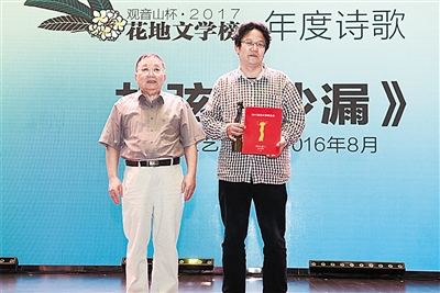 著名作家刘斯奋(左)为胡弦颁发奖杯、证书 羊城晚报记者 周巍 摄