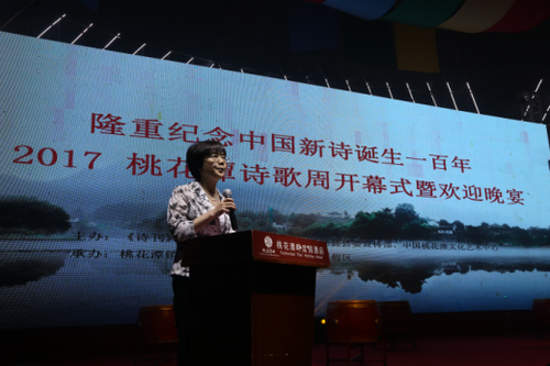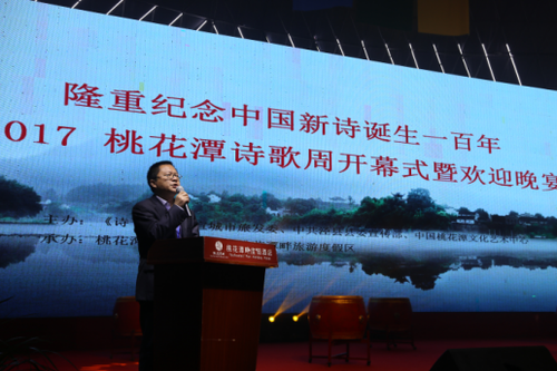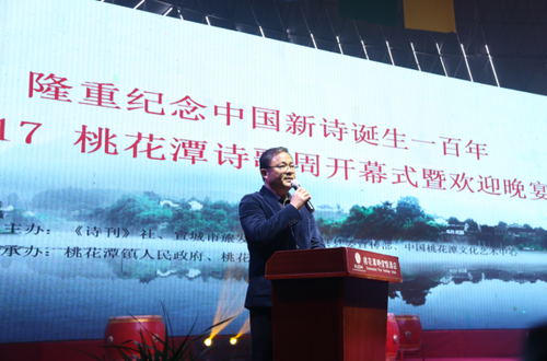 “桃花潭国际诗歌周自2014年至今已走过四个年头,对于如何将诗歌文化活动做好、做的有价值,多年来我们也在不断的尝试、摸索。可以说桃花潭诗歌活动一直在不段的成长中,我们也非常高兴,一路走来有着诗人及各界朋友的支持与鼓励,在这里,我代表桃花潭国际诗歌周对各位表示衷心的感谢。人类天生具有思考、感受的天赋,并创造诗歌、绘画、音乐等多种形式来展现智慧的结晶。上天赐予我们如此才能,若不加以善用,岂不是对美好世界的辜负。桃花潭从诗仙李白《赠汪伦》中一汪潭深情浓的碧水,是灵感的源泉,也是历代文人墨客诗礼神往的地方,本届桃花潭诗歌周主题为“纪念新诗诞生百年之精心·且慢”,就是希望当大家身处桃花潭这片诗意山水时,可以调节自己,试着跟随桃花潭呼吸与脉搏的节奏,慢一点,再慢一点,静静的感受与品味,倾听自然万物,倾听我们的生活,倾听内心的声音,让感觉与情感不由自主的对这个世界做出反应,创造出更多优美的诗句篇章,为中国新诗发展注入灵净的血液。今天是2017桃花潭国际诗歌周开幕,也是世界读书日,弗朗西斯·培根说:“阅读使人充实,诗歌使人巧慧”,但愿我们都能始终保持求知的欲望,保持对世界的感性,让生活源源不断的注入智慧与诗意。”