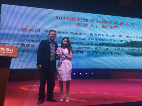 在24日的颁奖吟诵晚会上,来自上海的缎轻轻、江西婺源的龙安,分别以《万物规律》、《雨中的三月》等诗歌组诗作品获得2017年桃花潭国际诗歌周新人奖,桃花潭文化艺术中心创始人、桃花潭国际诗歌周策划人之一韦国平与中国作协《诗刊》副主编李少君为获奖选手颁发了新人奖。