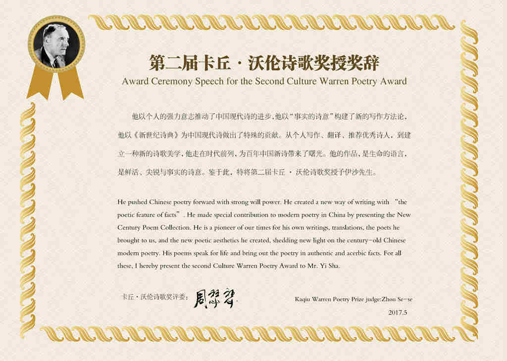 第二届卡丘•沃伦诗歌奖受奖词:当我青年时代的朋友周瑟瑟通知我获得了第二届卡丘•沃伦诗歌奖的时候,我想起了上世纪90年初我收到他来信的情景:在西安外国语学院一间简陋的小平房里,我拆开他的来信,里面掉出他与邱华栋在武大的合影:两人一瘦一胖,头发一长一短……那时我刚毕业不久,他们还在学校里,那时我们除了年轻一无所有,试图通过个人奋斗登上诗坛或文坛,今天当我读到第二届卡丘•沃伦诗歌奖的授奖词,发现年过半百的自己拥有的比当年梦想的要多,而又被我青年时代的朋友所见证,便有一种说不出的幸福感与奢侈感:原来诗歌真的可以提升一个人、强大一个人、纯粹一个人!还是在当年,当我面对身边一批走出校园便纷纷退役的同代校园诗人,我在心里说:我才刚玩出一点乐子,你们就不玩了-今天,我心中又响起了这个年轻的骄傲的声音!上个月,我和瑟瑟一起到了美丽的青岛,我们的眼前是一片碧海蓝天,我在心中吟诵着我译的沃论名篇《尘世鸟儿》中的句子:“多年过去,所有的地方和容颜都褪去了颜色,一些人已经死去/我站在辽远的陆地上,夜深人静,终于确定/我怀念鸟鸣的沉静比某些日后注定衰败的事物,更多。”感谢朋友!感恩诗歌!感怀岁月!感受命运!(伊沙,2017年5月11日于长安)