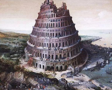 巴别塔,《创世记》11:1-9:“那时,天下人的口音,言语,都是一样。他们往东边迁移的时候,在示拿地遇见一片平原,就住在那里。他们彼此商量说,来吧,我们要作砖,把砖烧透了。他们就拿砖当石头,又拿石漆当灰泥。他们说,来吧,我们要建造一座城和一座塔,塔顶通天,为要传扬我们的名,免得我们分散在全地上。耶和华降临,要看看世人所建造的城和塔。耶和华说,看哪,他们成为一样的人民,都是一样的言语,如今既作起这事来,以后他们所要作的事就没有不成就的了。我们下去,在那里变乱他们的口音,使他们的言语彼此不通。于是,耶和华使他们从那里分散在全地上。他们就停工,不造那城了。因为耶和华在那里变乱天下人的言语,使众人分散在全地上,所以那城名叫巴别。”