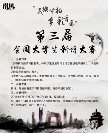 “民族节拍 多彩青春”第三届全国大学生新诗大赛在2017年6月正式开幕。