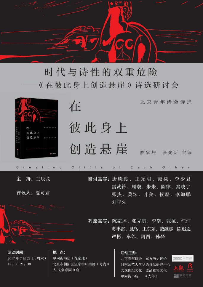 一群个性鲜明而又以团体面目呈现的诗人、批评者,尝试用一种美学方式,测探知识分子内部在历史、身份、文化偏好和友爱政治上的诸多分歧。通过“桥与门”“成为同时代人”“诗歌正义”等一系列与公共空间相关联的诗学探讨,北京青年诗会聚集了一批在北京生活的优秀青年诗人,在一个噤声的时代,重新寻找一种庄严而典雅的诗性生活。《在彼此身上创造悬崖——北京青年诗会诗选》由发起者陈家坪和张光昕主编,编选了陈家坪、李浩、张杭、江汀、苏丰雷、昆鸟、王东东、戴潍娜、陈迟恩、严彬、车邻、阿西、孙磊共13位诗人的作品。题名“在彼此身上创造悬崖”,取自戴潍娜《海明威之吻》中的诗句。如夏可君所言:“发现彼此身上的悬崖,这暗示出时代与诗性的双重危险与危急,而诗歌写作是对危急时刻的敏感与回应。”诗歌写作如何对生活与命运解咒?如何打开时空梦想的褶皱构成对诗歌写作的挑战?如何重建现代诗歌的历史叙事?如何进入现代都市生活的真实?如何从真实的生活上升到诗性的真理并以存在的真理教导时代?
