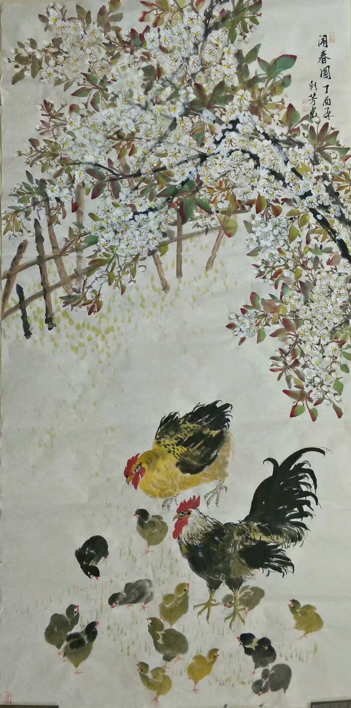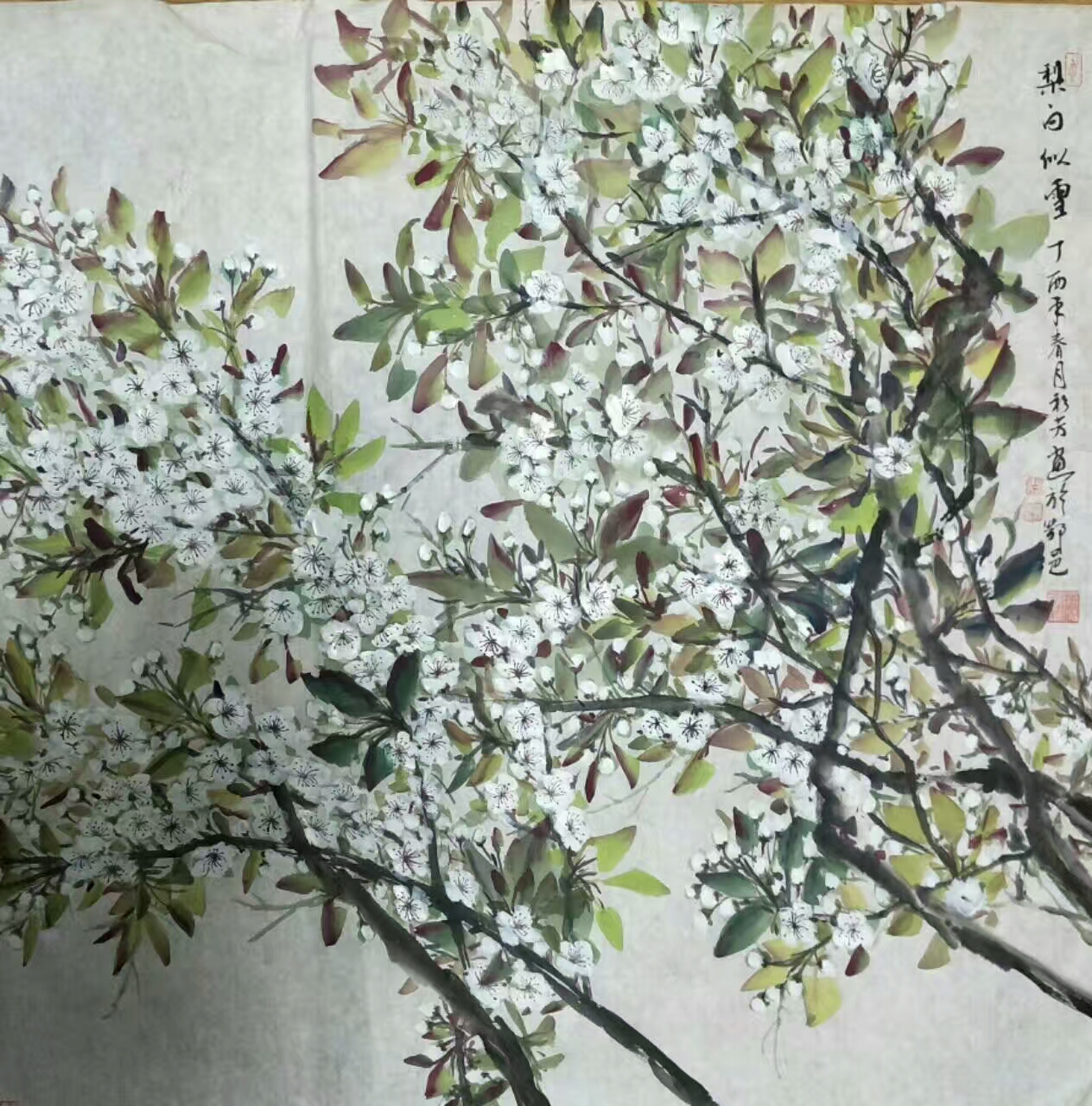 裴彩芳:梨花品质圣洁、清廉,梨花色形柔韧、娇媚,梨花性能解毒、清肺、抑火。刚画梨花试图能画出它的高雅与独特,画中发现它盛开于春初,抖落寒峭、洁白如雪、繁盛气旺、刚柔相济的品行其它花树无法可比,历代画家描绘梨花大多数都是独树一帜,稀疏有致。我更想画出它“忽如一夜春风来,千树万树梨花开”的壮美和盛大。所以铺排画面几乎繁密、拥扰、不留死角。这种画法也受到了很多同仁的不解和批评,他们更侧重梨花占于画面中一小点做点睛之笔。