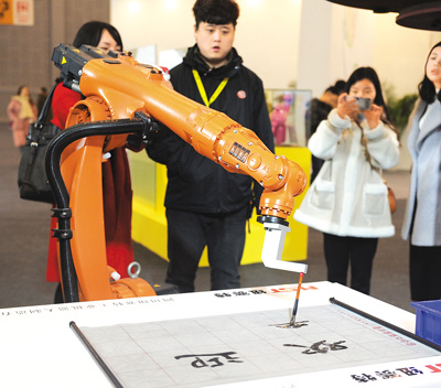 观众在成都创意设计产业展览会上观看机器人写毛笔字。 新华社记者 金马梦妮摄