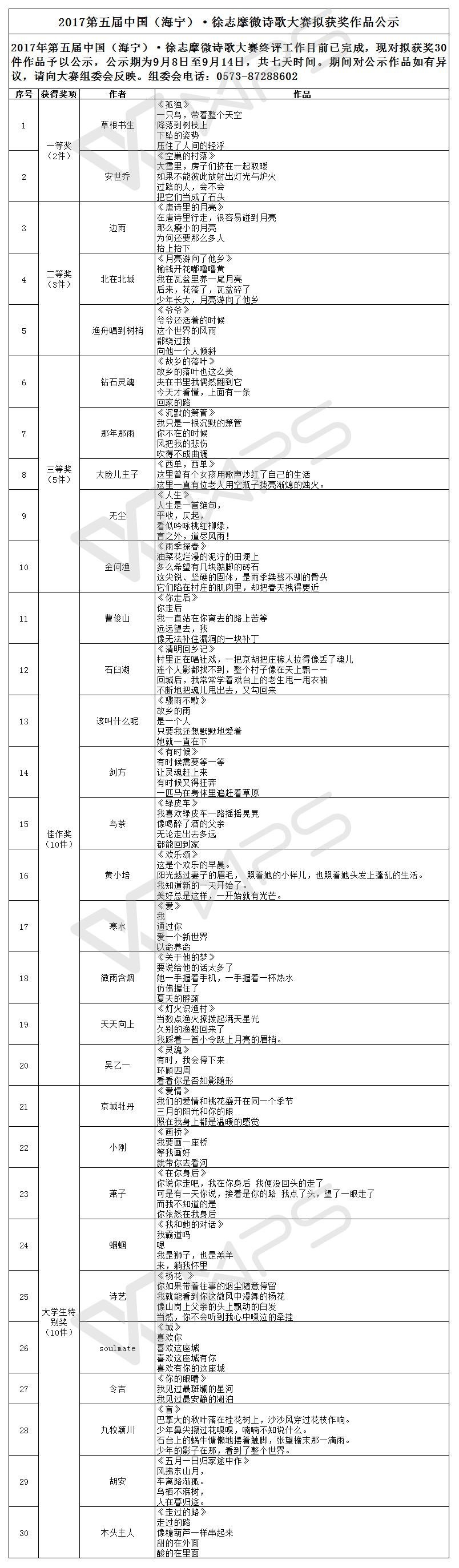2017第五届中国(海宁)·徐志摩微诗歌大赛于今年4月14日启动征稿,7月14日截稿,3个月共收到稿件27984首。据大赛组委会介绍,本届微诗歌大赛呈现影响更广泛、作者更年轻、作品更优秀的特点。