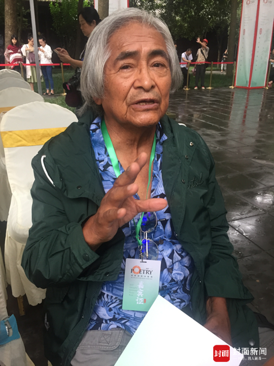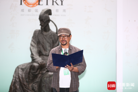 美国印第安诗人西蒙·欧迪斯,是青海湖国际诗歌节金藏羚羊获奖人。对这场朗诵会他表现出非常浓厚的兴趣。他对杜甫雕像非常感兴趣,在朗诵会开始之前,他就高兴地上台与之合影。他说,自己对中国诗歌的了解虽然不多,“但很早就知道杜甫的诗歌,知道杜甫诗歌在中国文化中的地位。”来成都几天,去过几个地方,“也让我感受到,在这里人与人之间的关系之密切,人与土地的关系非常密切。”