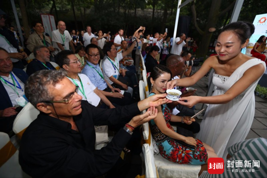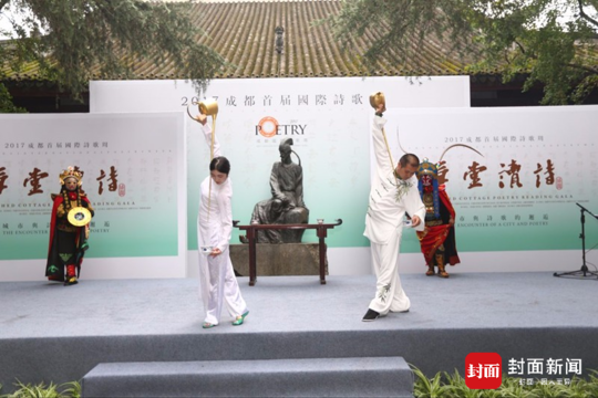 在诗歌朗诵的同时,川剧唱段、水袖舞蹈、川剧变脸、茶艺、中国功夫,来自欧洲的民谣乐队带来的清新文艺的演出,自然穿插其中,深深吸引了中外诗人们,以及在草堂的普通游客们。现场爆发出阵阵雷鸣般的掌声。著名汉学家、美国诗人梅丹理,剑桥大学国王学院副院长斯蒂芬·切利,以色列诗人阿米尔·欧尔,以及沈苇、娜夜、树才、高兴、雷平阳、李亚伟、李琦、向以显、李永才等人都神情专注,很多诗人都拿起手机一直对着台上录像。