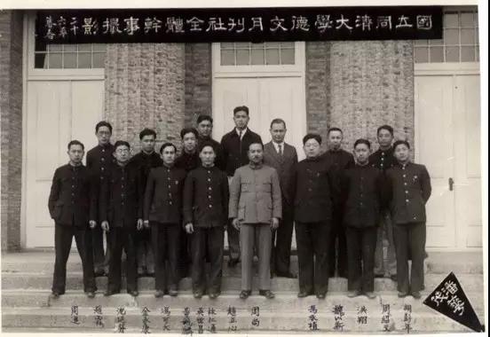 图丨冯至(前排右三)与同济大学德文月刊社全体干事的合影,1937年暮春摄于吴淞同济大学主楼前。(照片由阿尔布雷希特·赖因瓦尔特先生提供)