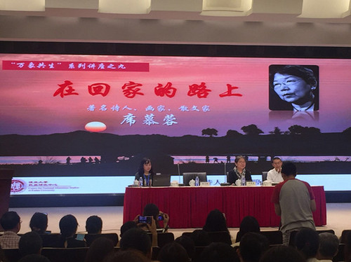 9月18日,席慕蓉应邀在复旦大学民族研究中心举行的“万象共生”系列讲座上做了题为《在回家的路上》的讲演,讲述她的成长,她的诗,以及追寻“原乡”的历程。她在现场朗诵了几首诗作,兴之所至,手舞足蹈,讲到动情处又几度哽咽。