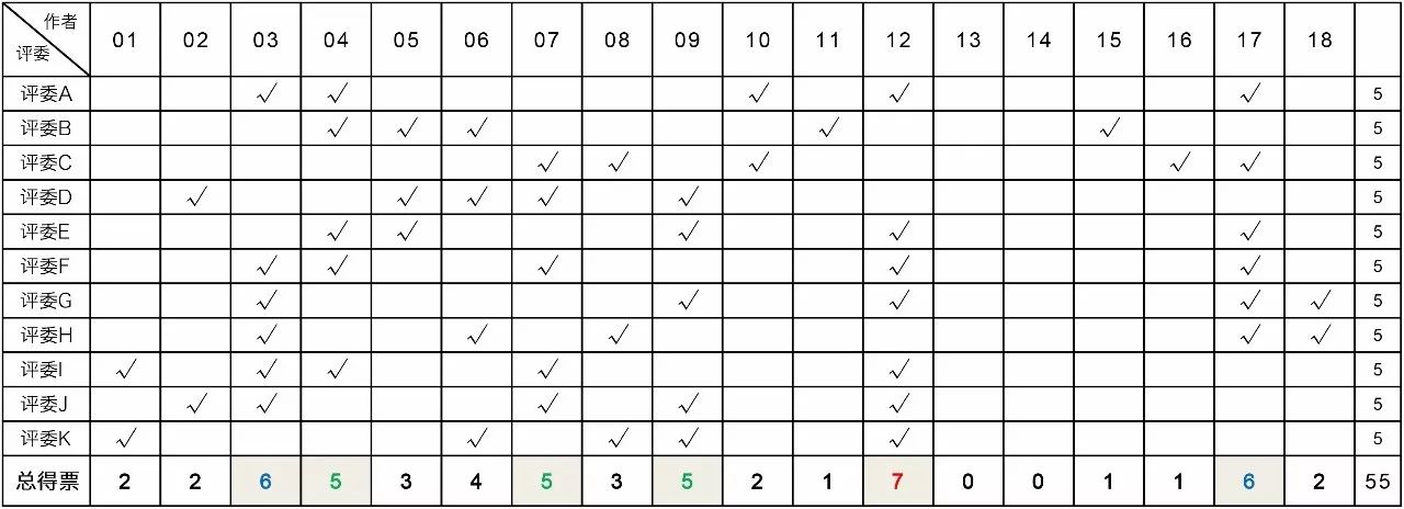 以上18位候选诗人的稿件经匿名编号后,交由11位评委独立投票。各评委投票情况如下(评委编号以提交投票的时间先后排序):