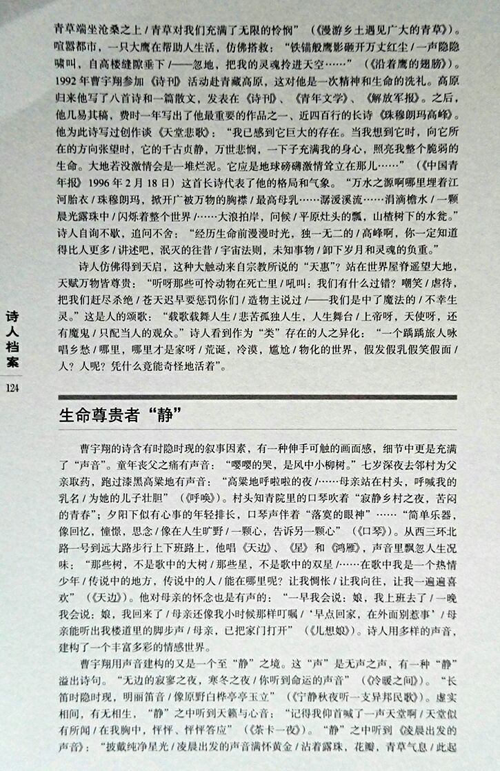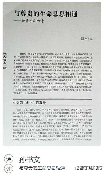 曹宇翔1957年出生于山东兖州前胜村。如《宇翔的歌唱》所写:“一个背着草筐的乡村少年,久久站在泗河岸边的空旷原野上,怔怔地望着远方……”(《人民日报》1996年8月21日)。他9岁时,参加过解放战争从部队转业的父亲病故,童年与重病的母亲和年迈的祖母相依为命。去年他在接受家乡电视台专访时多次说:“是故乡和母亲养育了我。”他的诗不是从纸上到纸上的诗,而是来自百感交集的生活和一言难尽的命运。“寒冬的夜晚/病中的母亲灯下编草帽/你在一旁念书/母亲让念出声来/你就念出声来//……一字不识的母亲/常常停下手中的活儿/听儿子念书的声音”(《为小油灯写一首诗吧》)。苦难中坚强的母亲和尊贵的母爱,无须藻饰。母亲和故乡是诗人勇于担当、奋力前行的人生动力。母亲随军来京生活了五年就去世了,他在《火车向故乡奔驰》中哀伤自语:“我再也没有母亲了。”母亲生前的万千情景萦绕于心,他写了长诗《儿想娘》:“……儿想娘,娘不在人间,娘在天堂/母亲啊,我们母子一场。”