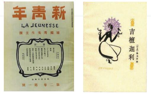 ▲《新青年》杂志(左图)是中国新诗发端的阵地。右图为冰心翻译的泰戈尔诗集《吉檀迦利》