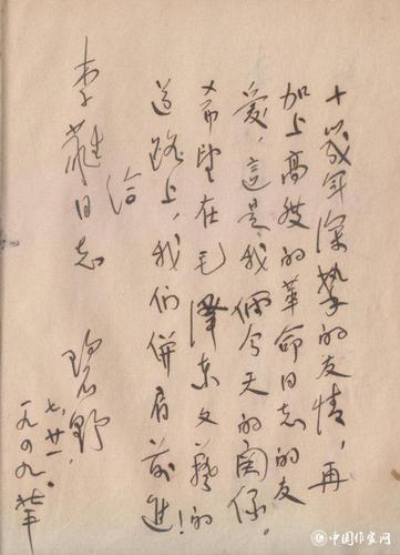 碧野题词:“十几年深挚的友情,再加上高度的革命同志的友爱,这是我俩今天的关系,希望在毛泽东文艺的道路上,我们并肩前进!给李蕤同志。”