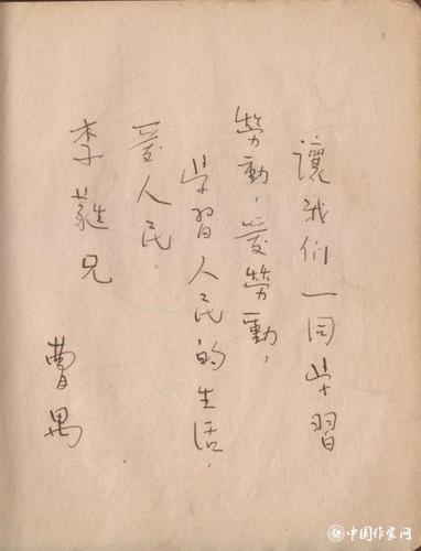 曹禺题词:“让我们一同学习劳动,爱劳动;学习人民的生活,爱人民。李蕤兄”