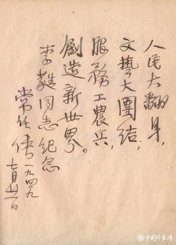 常任侠:“人民大翻身,文艺大团结,服务工农兵,创造新世界。李蕤同志纪念。”