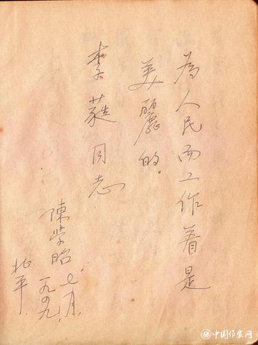 陈学昭题词:“为人民工作着是美丽的。李蕤同志”