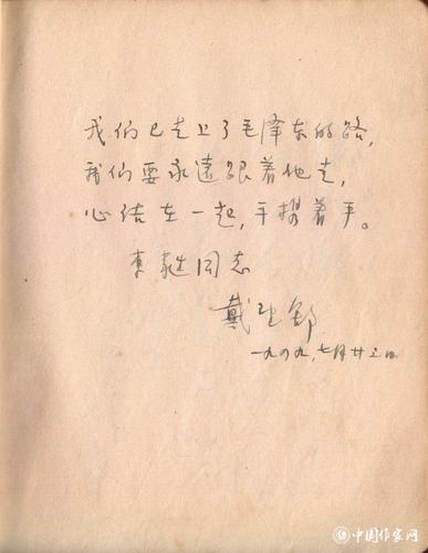 戴望舒题词:“我们已走上了毛泽东的路,我们要永远跟着他走,心结在一起,手携着手。李蕤同志”