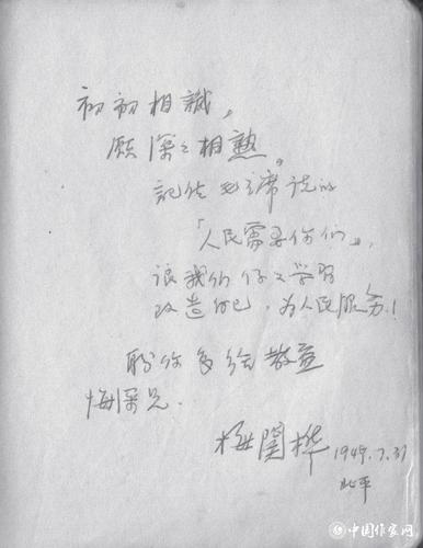 梅关桦题词:“初初相识,愿深深相熟,记住毛主席说的‘人民需要你们’,让我们好好学习,改造自己,为人民服务。盼你多给教益。悔深兄”