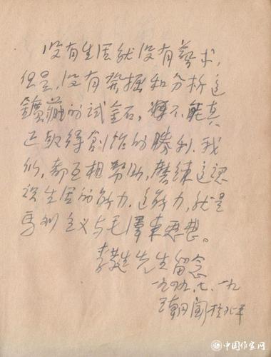 王朝闻题词:“没有生活就没有艺术,但是,没有发掘和分析这矿藏的试金石,不能真正取得创作的胜利,我们,都互相帮助,磨练这认识生活的能力,这能力,就是马列主义与毛泽东思想。李蕤先生留念”